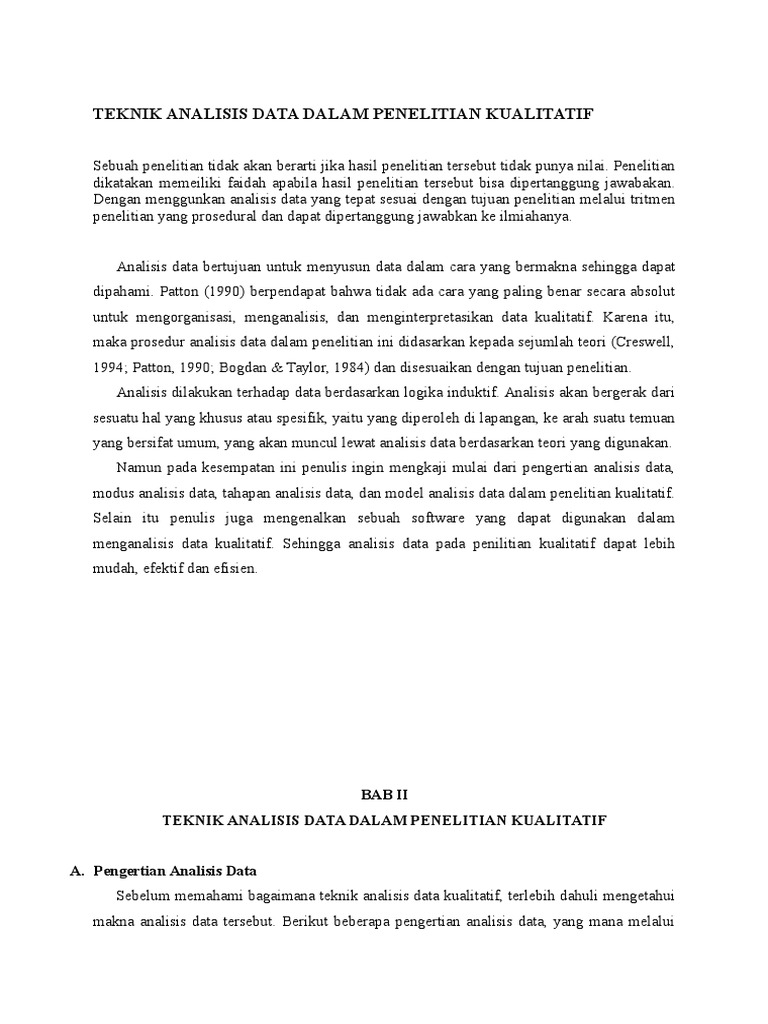 Contoh dari data kualitatif adalah catatan wawancara, transkrip fokus grup, dan lainnya. Pengertian analisis data kata analysis berasal dari analisis data dimaksudkan untuk memahami apa yang terdapat di balik semua data tersebut, mengelompokannya 2009. Wan mohd khairul firdaus wan khairuldin unisza. Teknik analisis data adalah suatu metode atau cara untuk mengolah sebuah data menjadi informasi sehingga karakteristik data tersebut menjadi mudah untuk dipahami dan juga bermanfaat untuk menemukan solusi permasalahan, yang terutama adalah masalah yang tentang sebuah penelitian. Metode penelitian kuantitatif & kualitatif.